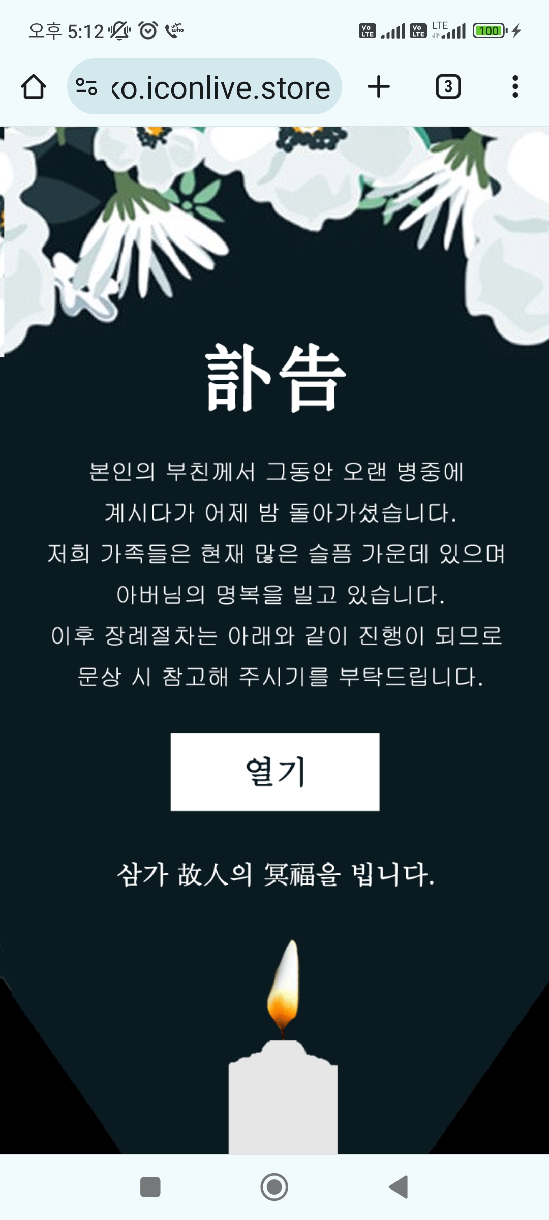 보통 고인의 성명, 상주 이름 등 필수적인 사항이 문자에 포함되어 있지 않습니다. 위의 단축 링크가 연결된 페이지는 아래와 같았습니다.