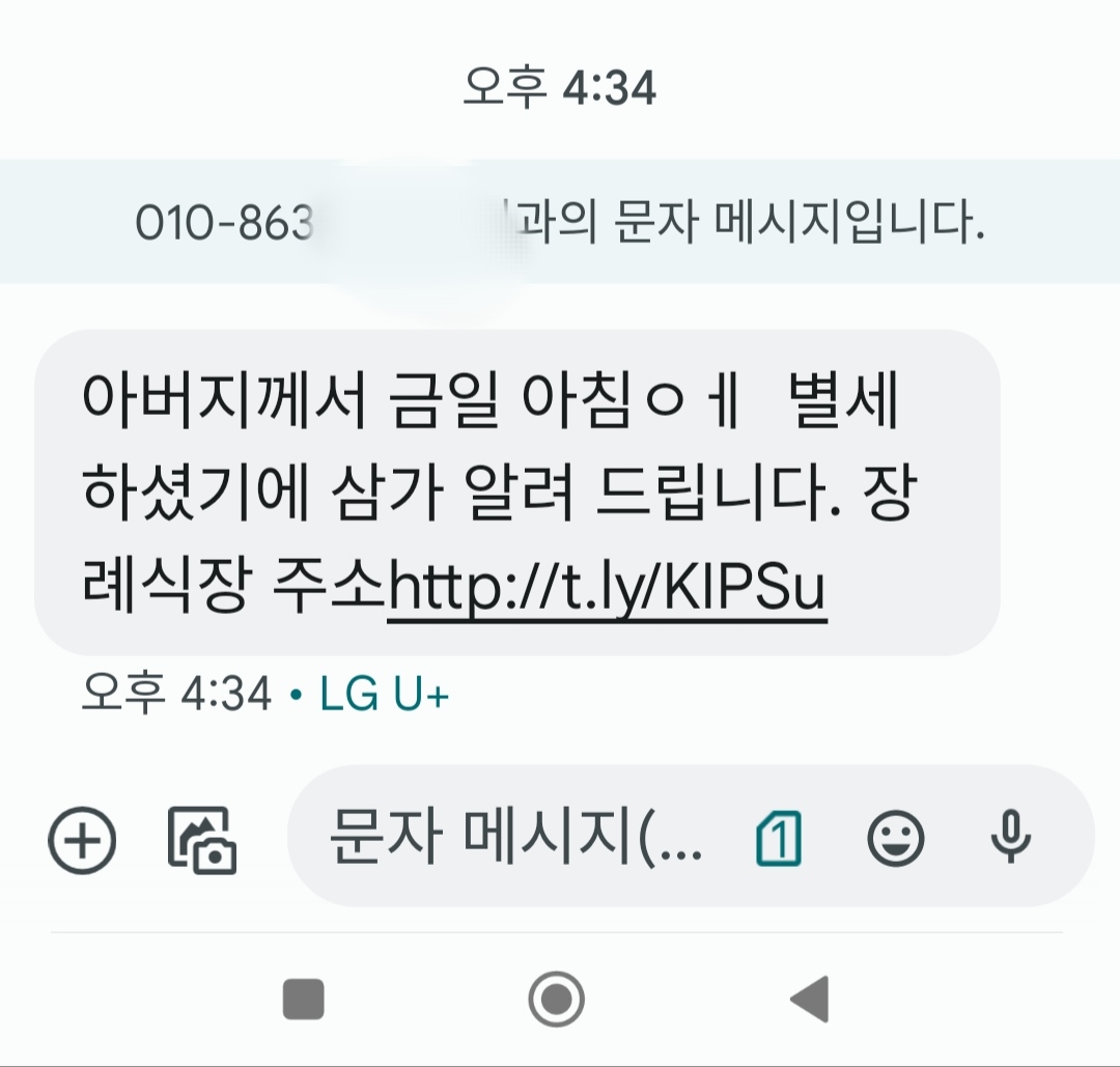 부고장 스미싱이 최근에 증가하고 있다는 뉴스는 사실 못본 상태였습니다. 오늘 오후에 약 10분 간격으로 2건의 부고장 문자가 들어 왔습니다. 그러다보니 진짜 부고 안내 문자인가? 하여 문자를 클릭하게 되었습니다.