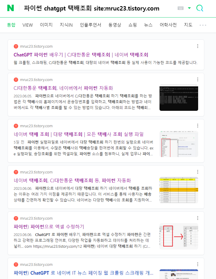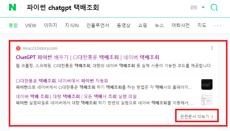 티스토리 블로그가 아래와 같이 검색이 됩니다.  관련문서 더 보기를 클릭하면, 블로그의 모든 글이 조회되는 것을 확인할 수 있습니다.
