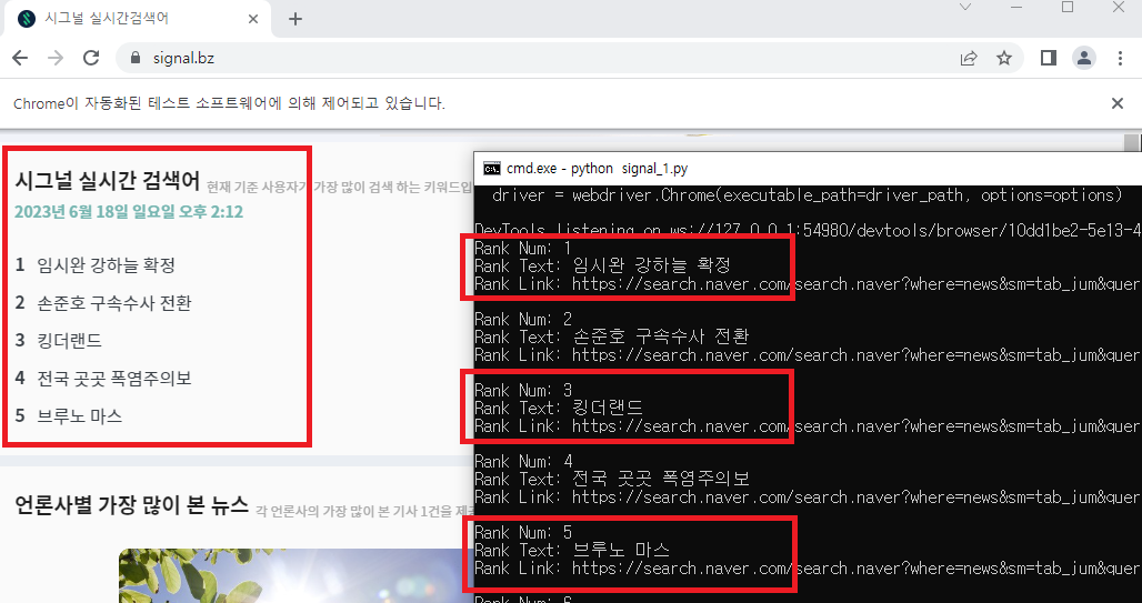 좌측의 signal.bz 사이트에 표시되는 시그널 실시간 검색어의 순위, 검색어, 숨어있는 링크까지 파이썬 프로그램에서 잘 가져와서 출력하고 있음을 확인할 수 있습니다.
