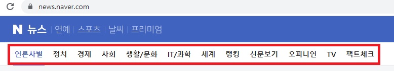 네이버 뉴스의 html 중 카테고리에 해당하는 부분 <li class="Nlist_item is_active"><a href=" https://news.naver.com/?viewType=pc " class="Nitem_link" role="menuitem" aria-selected="true" onclick="nclk(event,'lnb.pcmedia','','');"><span class="Nitem_link_menu">언론사별</span></a></li> <li class="Nlist_item"><a href=" https://news.naver.com/main/main.naver?mode=LSD&mid=shm&sid1=100 " class="Nitem_link" role="menuitem" aria-selected="false" onclick="nclk(event,'lnb.pol','','');"><span class="Nitem_link_menu">정치</span></a></li> <li class="Nlist_item"><a href=" https://news.naver.com/main/main.naver?mode=LSD&mid=shm&sid1=101 " class="Nitem_link" role="menuitem" aria-selected="false" onclick="nclk(event,'lnb.eco','','');"><span class="Nitem_link_menu">경제</span></a></li> <li class="Nlist_item"><a href=" https://news.naver.com/main/main.naver?mode=LSD&mid=shm&sid1=102 " class="Nitem_link" role="menuitem" aria-selected="false" onclick="nclk(event,'lnb.soc','','');"><span class="Nitem_link_menu">사회</span></a></li> <li class="Nlist_item"><a href=" https://news.naver.com/main/main.naver?mode=LSD&mid=shm&sid1=103 " class="Nitem_link" role="menuitem" aria-selected="false" onclick="nclk(event,'lnb.lif','','');"><span class="Nitem_link_menu">생활/문화</span></a></li> |