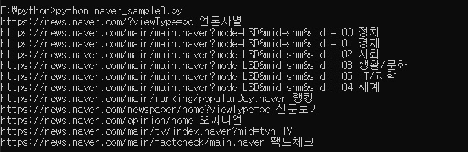 위와 같이 작성된 코드를 실행해보면 아래와 같은 결과로 표시됩니다. 네이버 뉴스의 카테고리명과 링크를 잘 갖고 왔음을 확인할 수 있습니다.