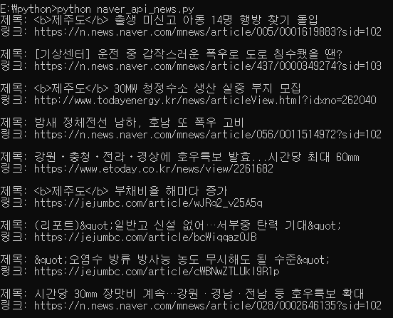 아래의 파이썬 코드는 네이버 API, 검색 API 를 이용하여, "제주도" 라는 단어가 포함된 기사 리스트를 확인합니다.