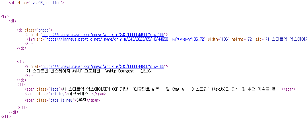 네이버 뉴스의 html 중 각 뉴스에 해당하는 부분 ![]() |