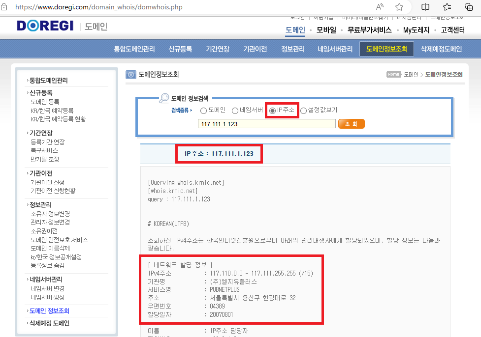 내 핸드폰의 공인 IP 주소는 네이버에서 "내 IP 주소"를 검색하면, 확인할 수 있습니다. 내 핸드폰의 공인 IP 주소 117.111.1.123을 입력하고, 조회를 해보면 엘지유플러스 통신사를 사용하고 있음을 알 수 있습니다. 이러한