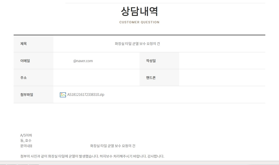 1. 타일 하자 보수 경험담을 말씀드리면, 아래와 같이 건설사에 하자보수 신청을 하고, 신청일자, 신청한 근거를 모두 보관을 해야 합니다. 절대 기록이 남지 않는 방법으로 하자보수 신청을 해서는 안됩니다. (개인정보는 삭제했습니다.)