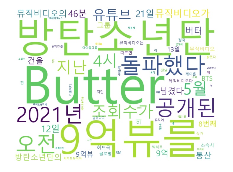 BTS Butter 9억뷰 라는 기사가 연이어 보도되고 있습니다. BTS 가 21년 5월에 발표한 Butter 뮤직비디오가 유튜브에서 9억뷰를 돌파했다고 합니다. 현재까지 보도된 네이버 뉴스를 API 로 검색하여, 파이썬 워드클라우드로 시각화를 해보면 아래와 같은 결과를 확인할 수 있습니다.