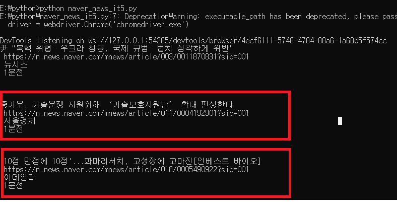 위와 같이 작성된 코드를 실행해보면 아래와 같은 결과로 표시됩니다. 네이버 뉴스 속보에서 제목, 링크, 언론사명, 업데이트 시간 등을 잘 가져왔음을 확인할 수 있습니다.