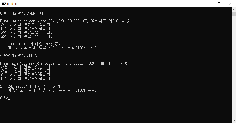 명령 프롬프트에서 PING WWW.NAVER.COM OR PING WWW.DAUM.NET 을 입력해보면, 아래와 같이 각 서버의 IP 주소를 확인할 수 있습니다. PING 오류가 나는 것은 업체에서 막아놓았기 때문입니다. 그 중 NAVER IP 주소를 도레지의 도메인 정보조회에서 입력해보면, 네이버클라우드의 IP 주소대역인 것도 확인할 수 있고, 주소 등 여러가지 정보 확인이 가능합니다.